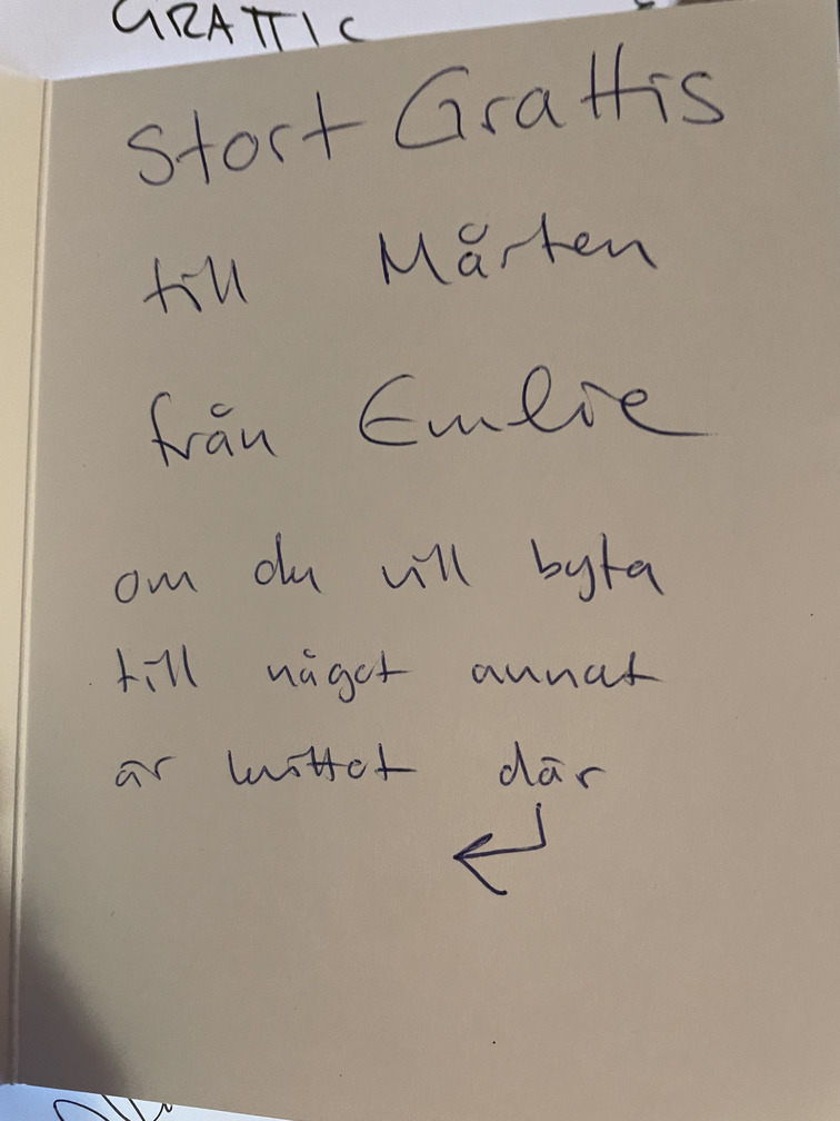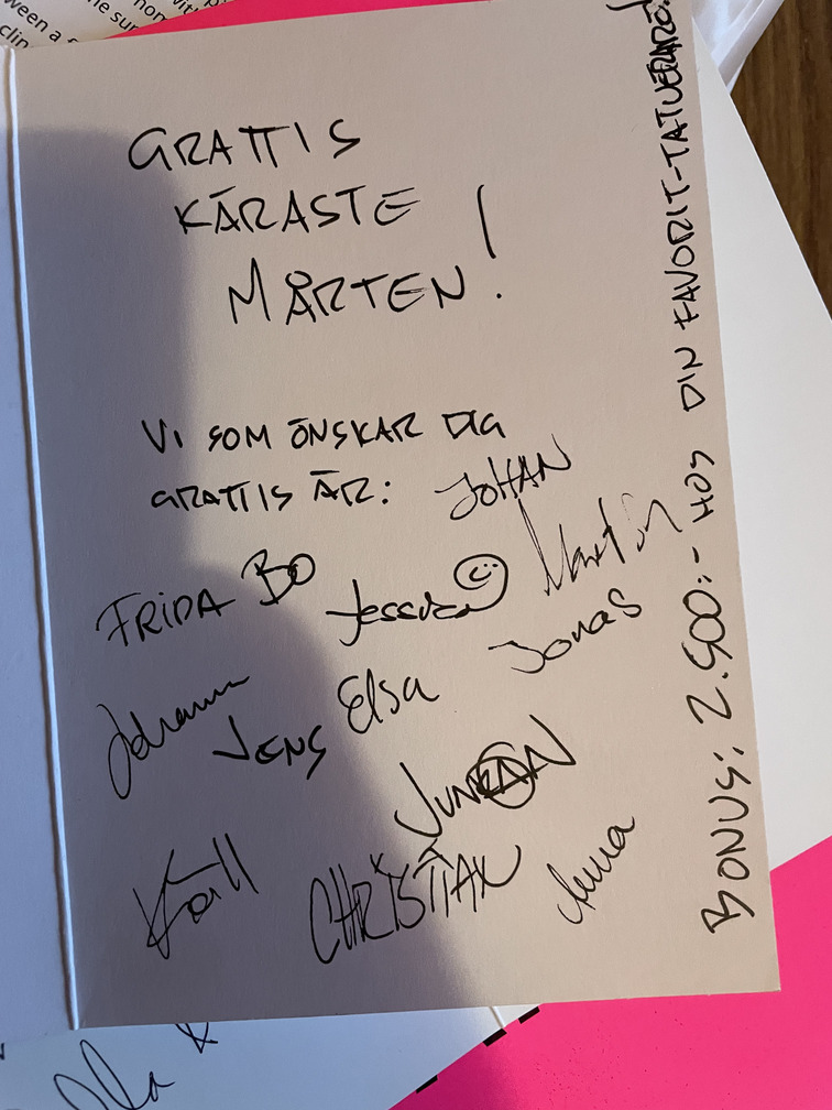 Här är alla presenter jag fick. Med kort och vem de kom ifrån. Räkna ut själva hur det hänger ihop.